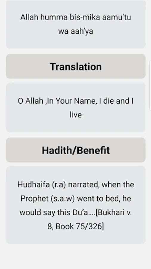 with each daily routine dua we give refrence easy pronunciation translation and Hadith/Benefits.