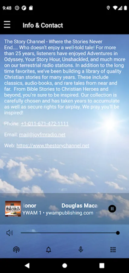 The Story Channel - Where the Stories Never End.... Who doesn’t enjoy a well-told tale! For more than a quarter of a century, listeners have enjoyed amazing audio adventures on our terrestrial radio stations. We’ve been building a library of quality stories - classics, audiobooks, and rare tales from near and far. From Bible Stories to Christian Heroes and beyond, you're sure to be inspired. Our collection was - and is - carefully chosen, and has taken years to procure while simultaneously securing rights for airplay. We pray you'll be enlightened on your journey toward the Celestial City!!!