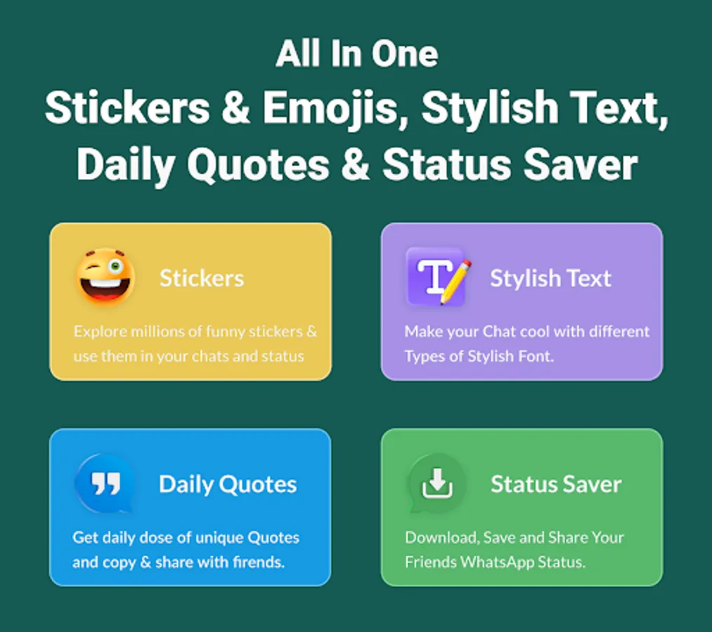 Make your WA chat more interesting with Cool Stickers, Emojis, and Fancy Text Styles. It automatically detects any WA Status Photos, Videos, and GIFs. WA Stickers & Fancy Text is a feature app for quickly Downloading any Status, Adding Stickers, and Sending Stylish Messages in one tap.