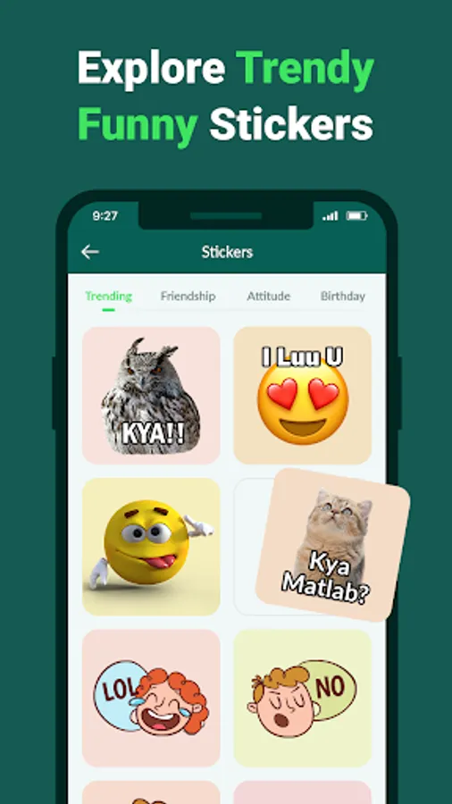 - Choose from different categories like Funny, Tmkoc, Love, Chat, Friendship, and more.