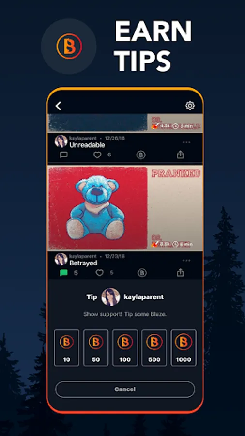 With our in-app currency Blaze, you can do lots of fun things! Tip Creators to show your support. Charge for a piece of content you created. Promote your content. Purchase Blaze from the App Store. Don’t’ want to spend any money? You can easily Earn Blaze by watching ads, sharing content, streaks and various other activities.