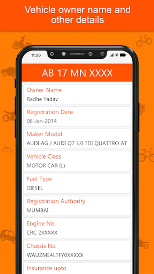 Enter vehicle number to get over a dozen vehicle registration details including real owner name, registration date, insurance expiry, etc.