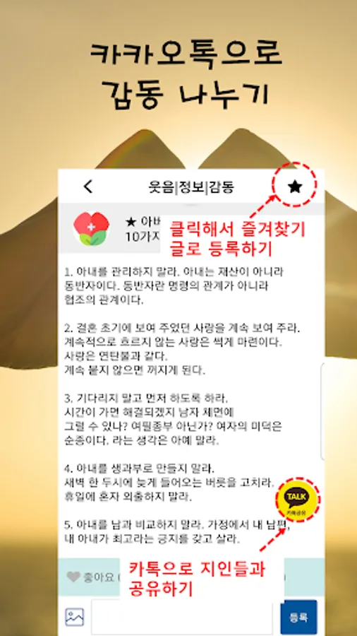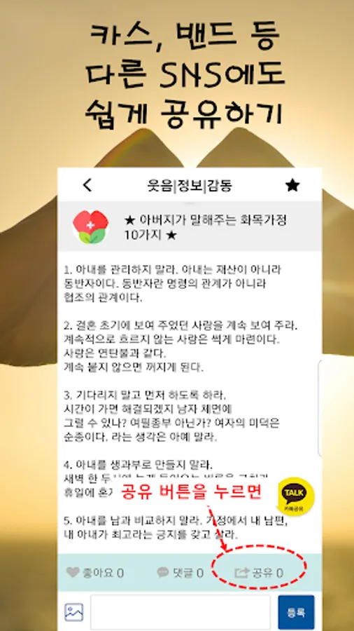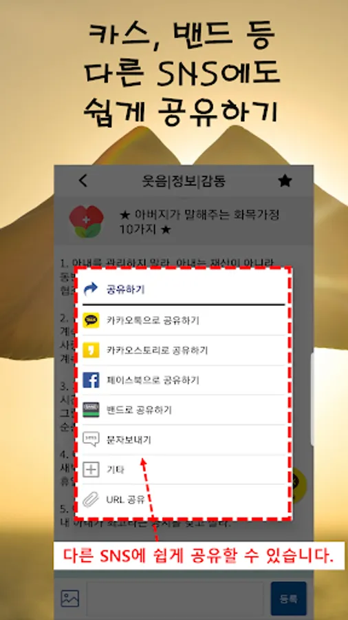 Kakao Talk, Kakao Story, Band, Facebook, Text, etc. can be shared with one button!