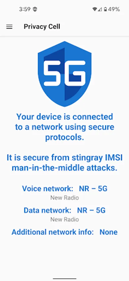 At the time of this writing, many cell phone networks are switching from 4G (4th Generation) to 5G networks. The 5G network protocols were specifically designed to protect against some of the known insecurities of the older protocols, including those that allowed stingrays (IMSI catchers) to perform man-in-the-middle attacks on cell phone networks. To ease deployment and backwards compatibility, 4G and 5G networks can run together in what is known as 5G NR (New Radio) NSA (Non-Standalone) mode. This uses the 4G network for the control channel and the 5G network for the data communication. However, 5G NSA does not provide protection against stingrays. Android has access to all the information it needs to know if it is connected to a 5G NSA or a 5G SA (Standalone) network, but it doesn’t display that information to the user. The purpose of Privacy Cell is to make that information easy to access.