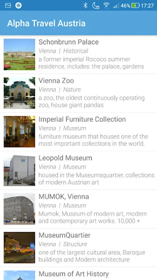 The App contains travel maps, travel guides and top tourist attractions with detail information, attractions are categorized as: Natures (Parks, Gardens, Beaches), Museums and Galleries, Religions (Churches, Mosques, Temples), Historical (Palaces, Castles and Historical sites), Public (Squares, Towns, Markets), Structures and Buildings, Sculptures (Monuments, Statues), and Viewpoints (any other Points of interests).