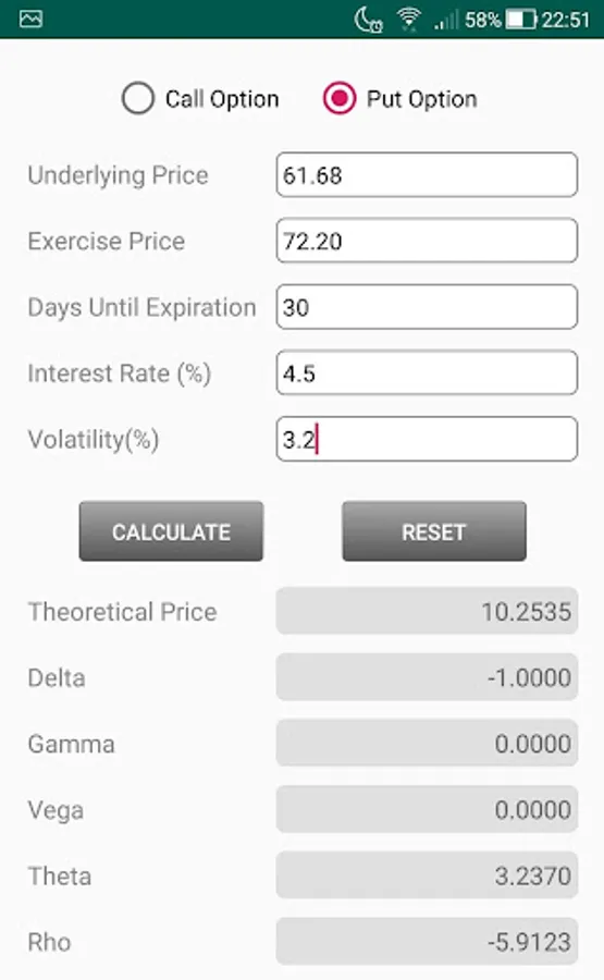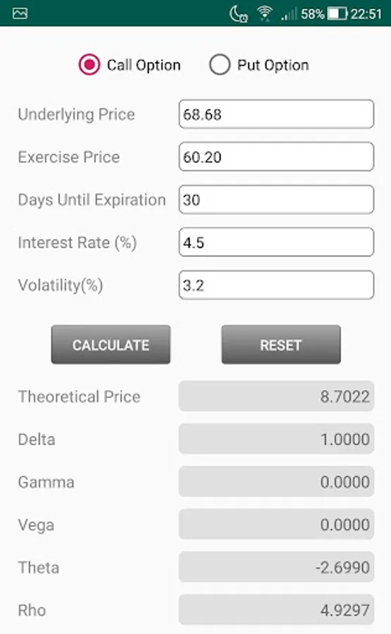 The app calculates option prices and option Greeks using Black-Scholes model. It is available for android 2.3 or above.