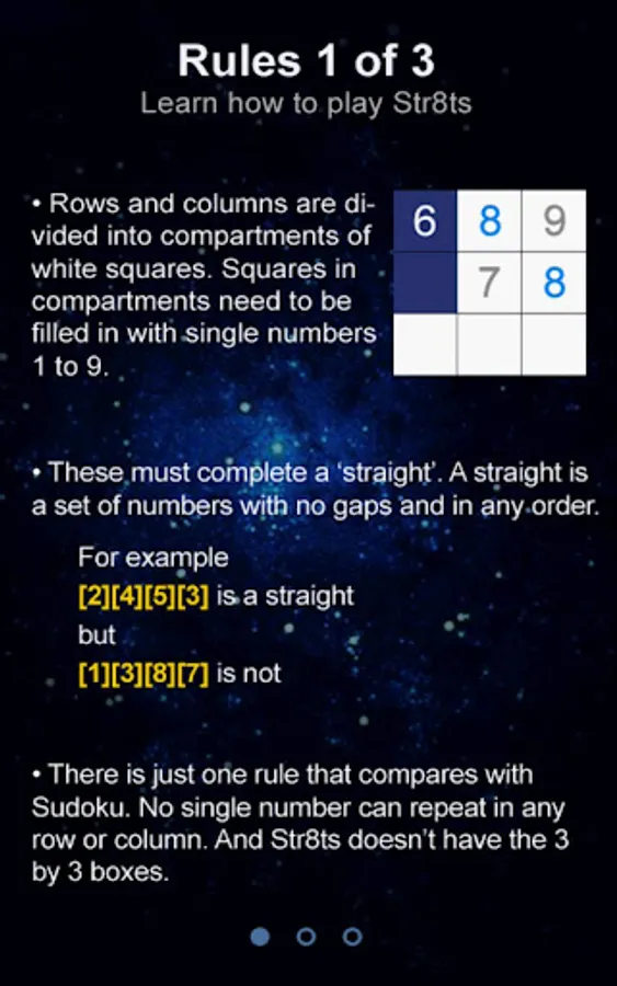 Str8ts is a number puzzle that is easy to learn, has simple rules, requires no math skills and is addictive as Sudoku. Few puzzles have the amount of depth and variety as Str8ts. You are encouraged to find multiple solving techniques as you progress between different levels of difficulties.