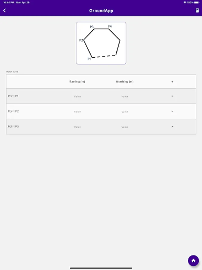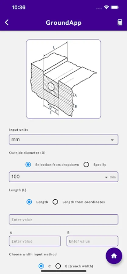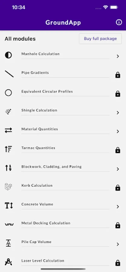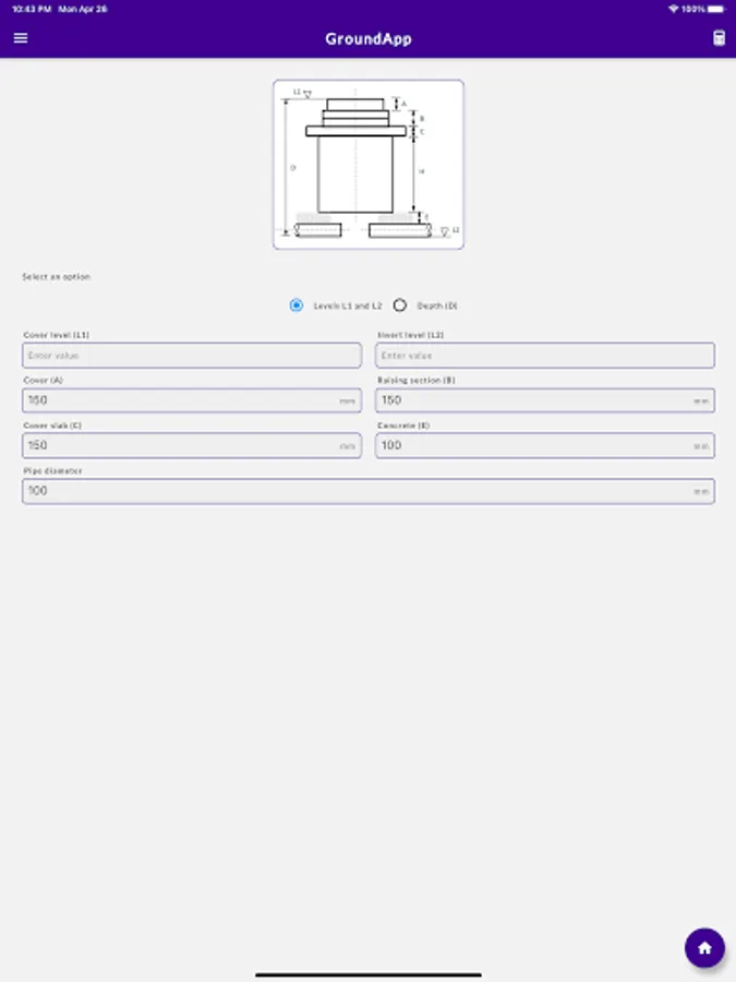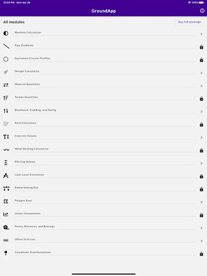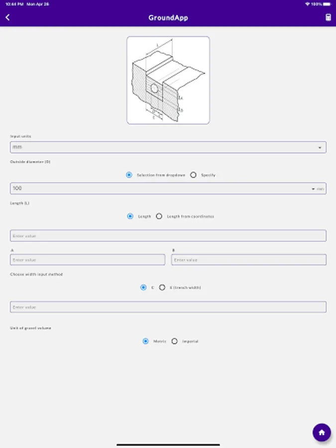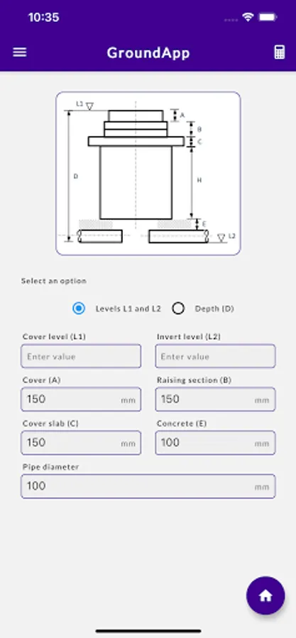 GroundApp is a mobile application developed as a one-stop solution for a wide range of calculations performed in groundworks in construction. The app is developed responding to a critical need in groundworks, where engineers use multiple, ad-hoc tools to routinely evaluate quantities and dimensions. This way, and mostly performed away from the office, calculations are cumbersome, time consuming, and error prone. Moreover, not knowing how to get around engineering references and conversion tables, groundworkers mostly rely on engineers to perform even the most straightforward of calculations. It is in this context that GroundApp is released as an easy-to-use tool for both engineers and construction workers. In this regard, the app is purposely designed to be simple for the use of workers, who might not necessarily have the required engineering background. The app hosts multiple calculation modules with clear and plain sketches and schematics. Modules tackle various calculations needed for groundworks, such as those involving manholes, kerbs, and pipes, among others. In addition, quantity conversions from weight to volume, and vice versa, are available for commonly used groundwork materials. Although metric units are presently supported by GroundApp, some modules are already enabled to perform calculations in imperial units. In the near future, all modules will also support imperial units. The standalone app, that works on both iOS and Android devices, does not require an internet connection to work. Once purchased, the app is available for lifetime use.