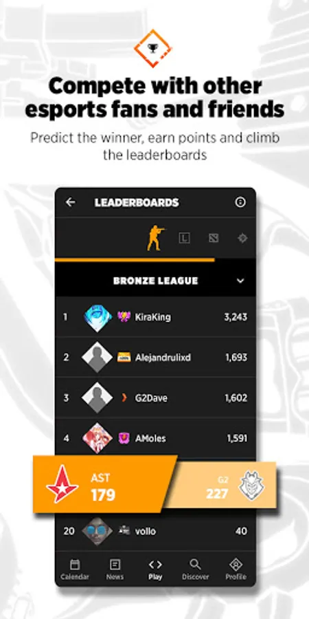Compare rankings ahead of big matchups and predict who you think will win in our prediction-based game, Strafe Score. Join in challenges specifically crafted around the biggest tournaments or simply vote on the matches you like. Earn points, compare your scores against other users, and climb to the top of our leaderboards to be crowned a Strafe champion!