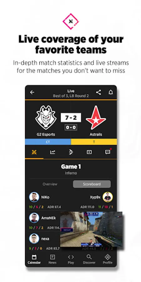 Strafe provides the most comprehensive esports experience you can find on mobile. From up-to-date scores and results to real-time statistics and news, we cover the biggest esport titles around the world, all year long. Follow your favorite teams, players and tournaments and personalize the app the way you want it! Always stay notified whenever matches go live and predict the winning teams to earn rewards! Never miss another beat with Strafe Esports.