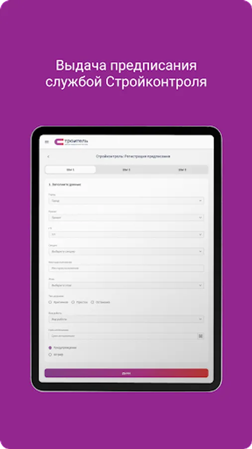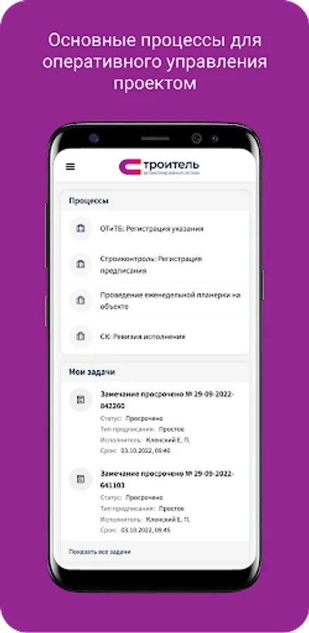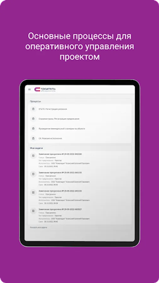 IT solution for process management in construction, which includes modules: Production planning, Meetings at the facility, Digital technical supervision, Control of HSE requirements, Delivery of works, Monitoring and controlling of the facility.