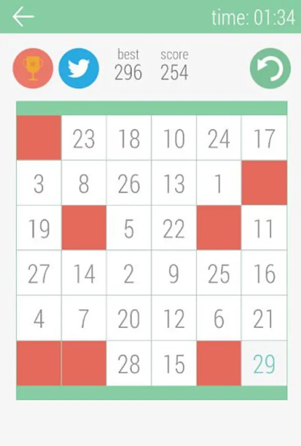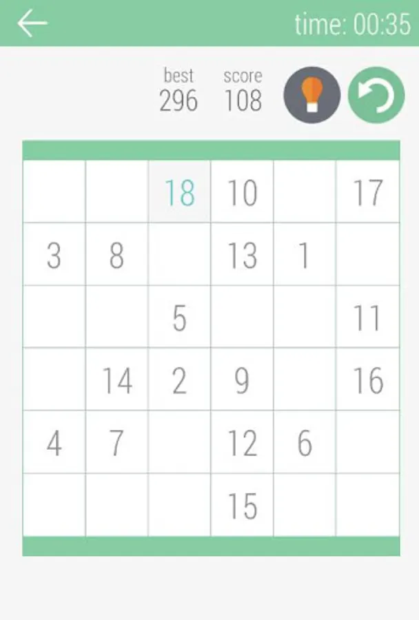 Playing 36 is simple: you have to fill the grid with numbers from 1 to 36, simply tapping the cells, but if you moving horizontally or vertically you have to leave two empty cells, otherwise if you moving diagonally just leave only one empty cell!