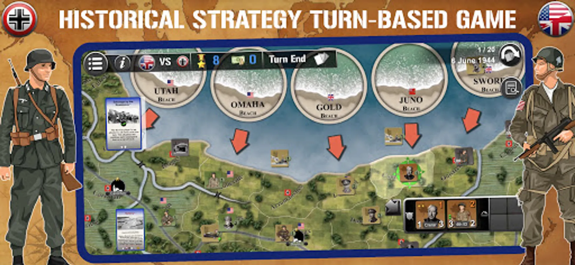 The application contains the scenario Normandy 1944. Several other scenarios are purchasable in content inApp, including: Hamilkar 264 (First Punic War), Hastings 1066 (Conquest of England), Saratoga 1777 (American War of Independence), Waterloo 1815 (Napoleonic wars), Bull Run 1861 and Missouri 1861 (Civil War), Tannenberg 1914 (World War I), Malaya 1941 (WW2 Malaysian campaign), Bulge 1944 (WW2 Battle of the Bulge), Berlin 1945 (End of World War II) ) and Six Days 1967 (Six Day War).