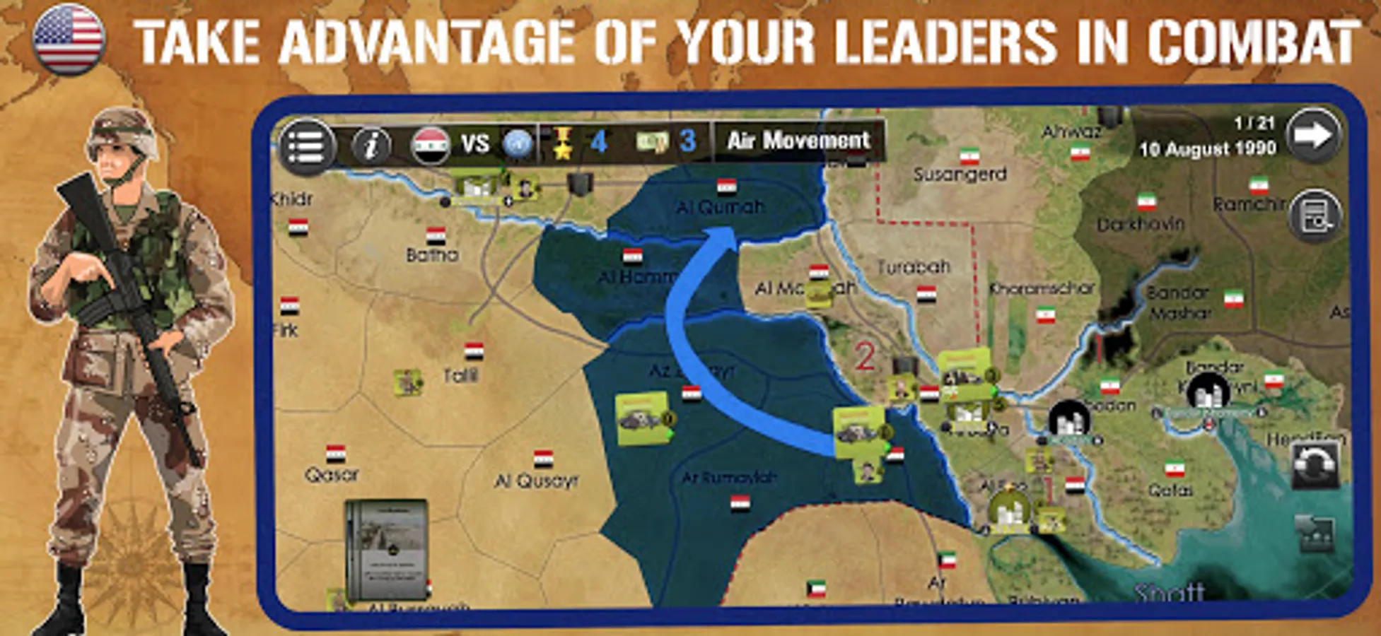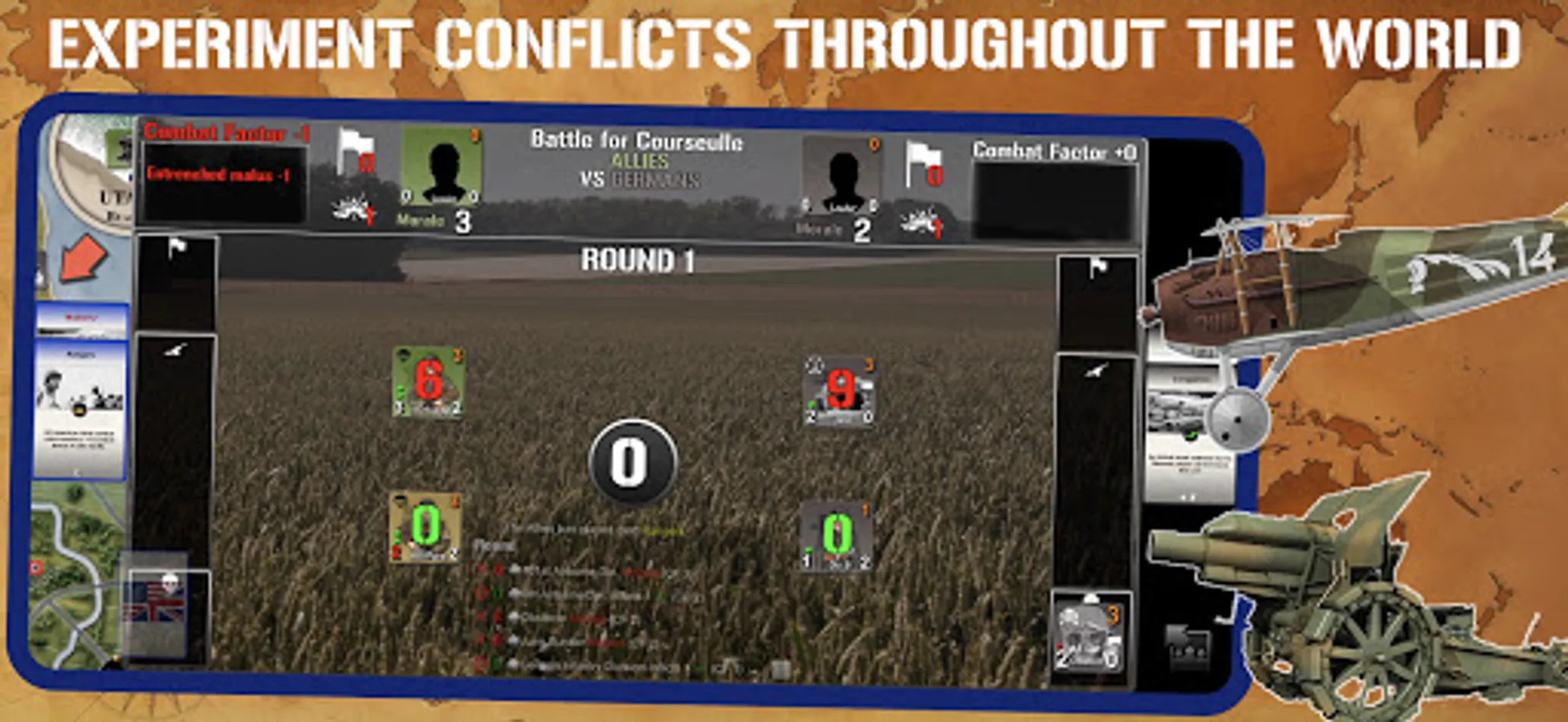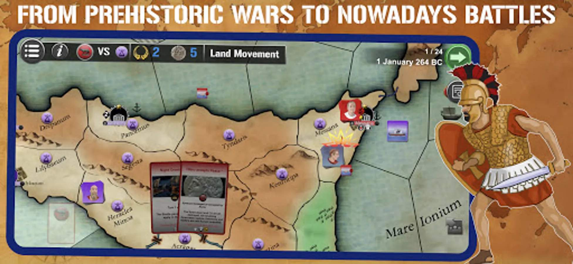 • Combat units may be from the land, naval or air domains. You will find different types, such as infantry, cavalry, artillery, guerrillas, submarines, flat tops, fighters, elephants, anti-aircraft batteries, etc ... All of which can be combined into different stacks for easy handling.