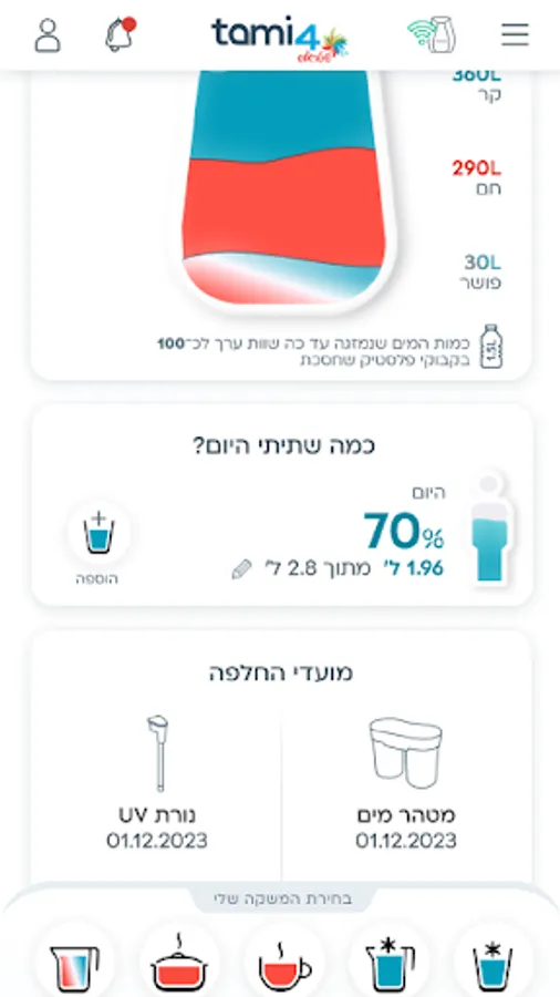 The improvements introduced in the new version include a new and more convenient process for connecting the water bar to the application, receiving a real-time indication of when to replace the tami4maze ™ water purifier