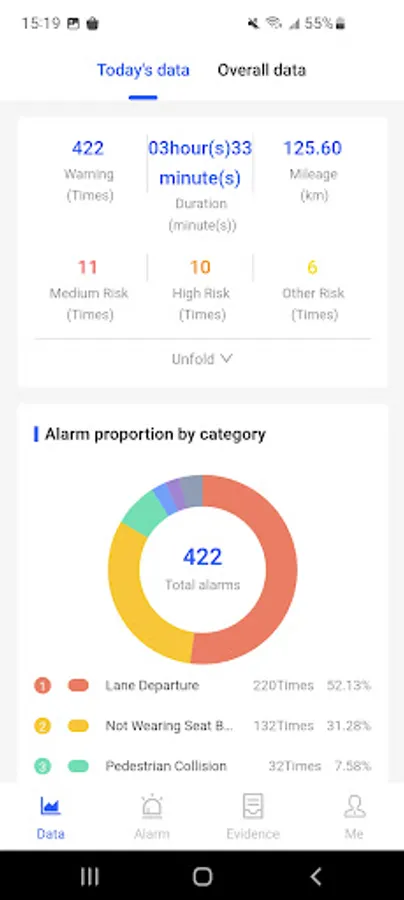 I. Drivers can log in to the app through the login page for drivers. They can use the main functions including viewing the daily driving records under Data, viewing the driving risk event records under Alarm, and viewing and editing the surveillance videos generated by vehicles in the past certain period of time under Evidence.