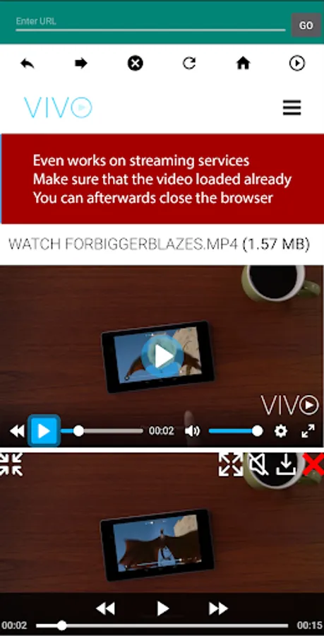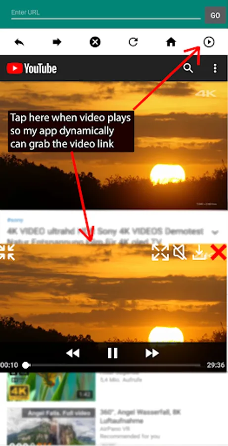 Simply open the browser, navigate to the video you want. FirsClick the Play button on the page! When its loading, simply click the play button in the upper right corner and it will try to stream it through my app!