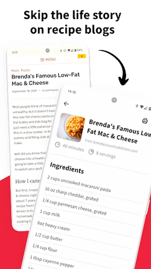 No more sifting through walls of text, photos, and ads. Share any recipe site from your web browser to Just the Recipe, and get straight to the cooking instructions.