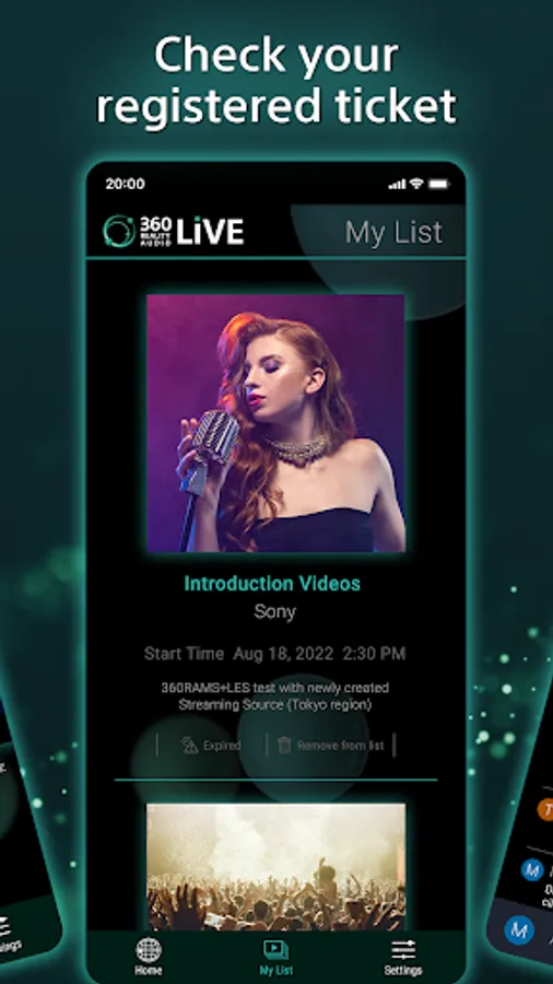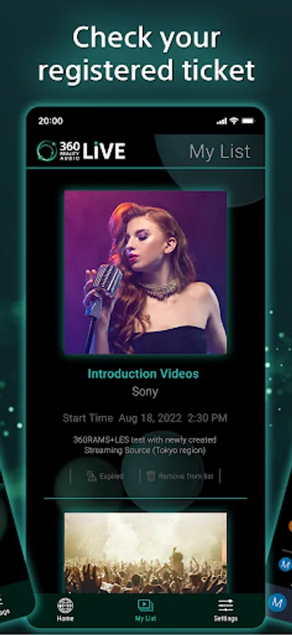 Purchase tickets at your preferred e-ticket agency service and obtain a 16-digit ticket code. Enter the 16-digit ticket code on the 360 Reality Audio website. In the 360 Reality Audio live application, under "My Page", select the icon for the live performance and play it