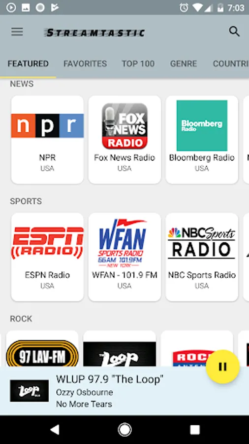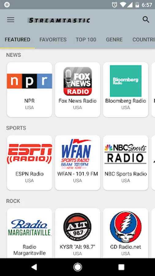 A few currently featured stations include BBC, NPR, Fox News, Bloomberg, ESPN, ABC Grandstand, Grateful Dead Radio, & Radio Margaritaville.