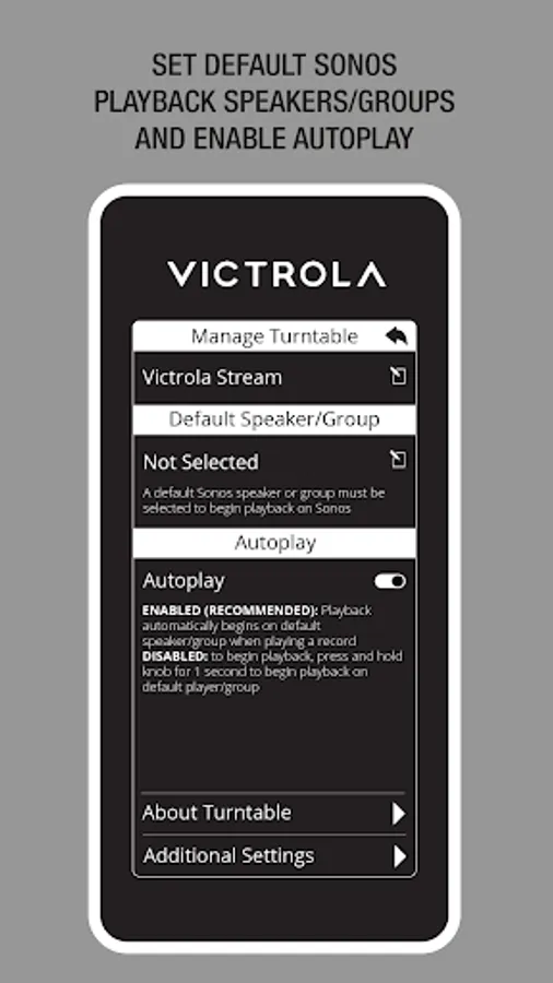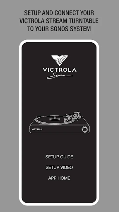 The Victrola Stream app provides easy setup and connects your Victrola Stream turntable wirelessly to your Sonos system in seconds. Once set up, the turntable fully integrates with your Sonos system. Use the Victrola Stream app to set default Sonos playback zones, enable autoplay, adjust turntable settings, and more.