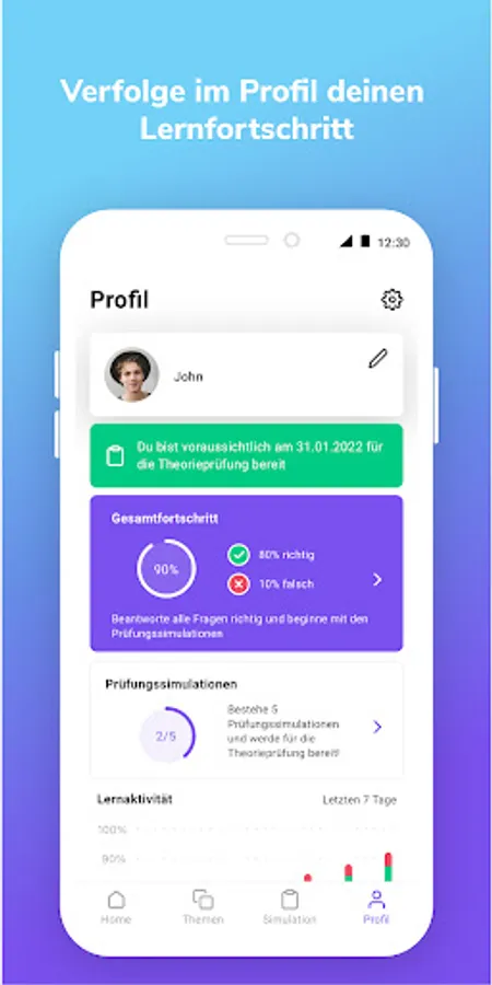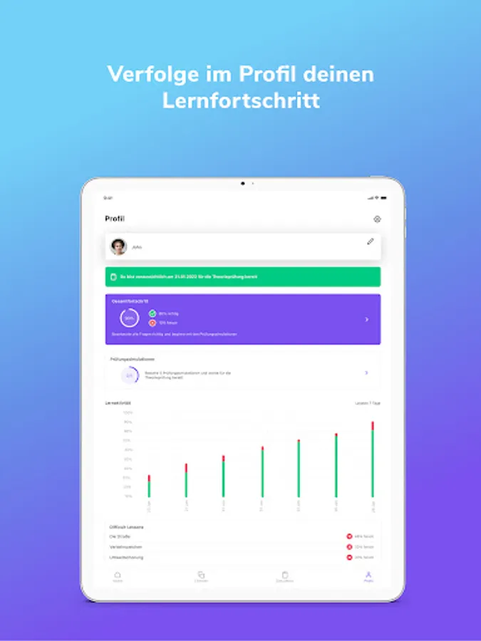 You can always see your current learning progress in your profile. Here you will always see the current date on which you are expected to be ready for the theory test.