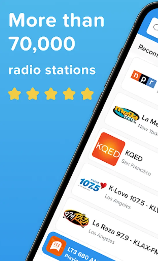 🎙 Listen to your favorite free FM & AM stations including: NPR Radio, BBC Radio, MRN, 77 WABC, La Mega 97.9, KNBR & WNYC. Catch up on news, listen to music or Christian radio & tune in to a huge range of live sports radio stations to catch the latest action from the NFL, MLB, NBA, MLS, NHL, Nascar & more.