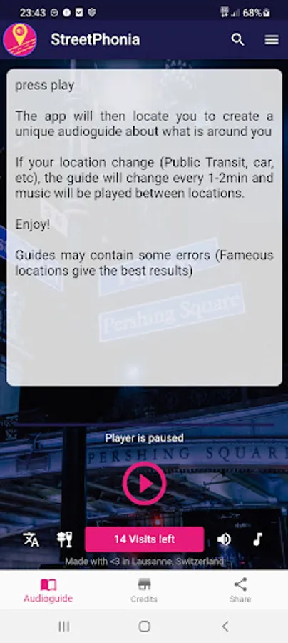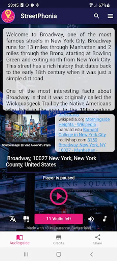 As you move, StreetPhonia generates short audio descriptions of your surroundings and displays the text on your device's screen while it is read aloud by a natural AI voice. The tours are created using information sourced from the internet and are available in multiple languages, making StreetPhonia a truly global tool.