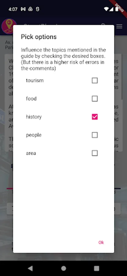 You may also choose to focus on specific topics like History, Tourism, or food, which will then influence the generated guide. But be aware, as it is still a new technology and made by AI, it may produce some errors, especially in areas that aren't really famous.