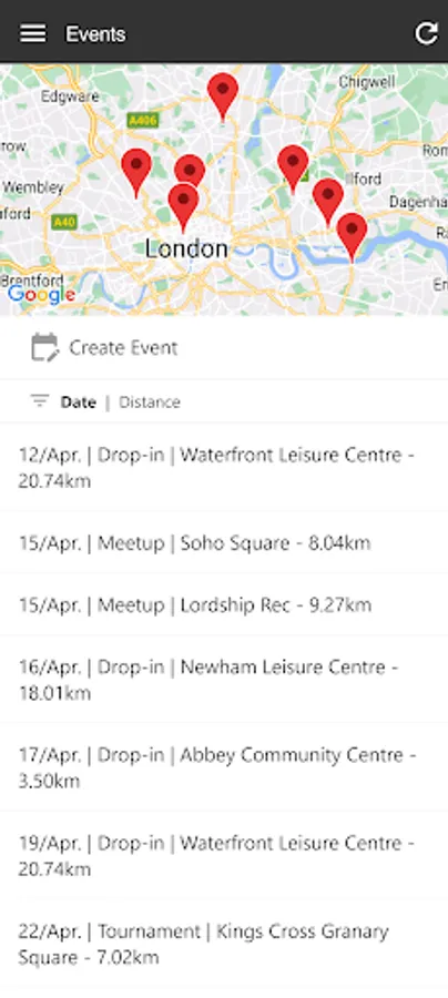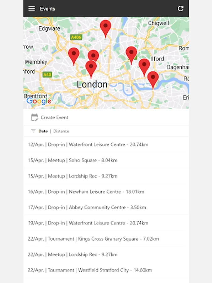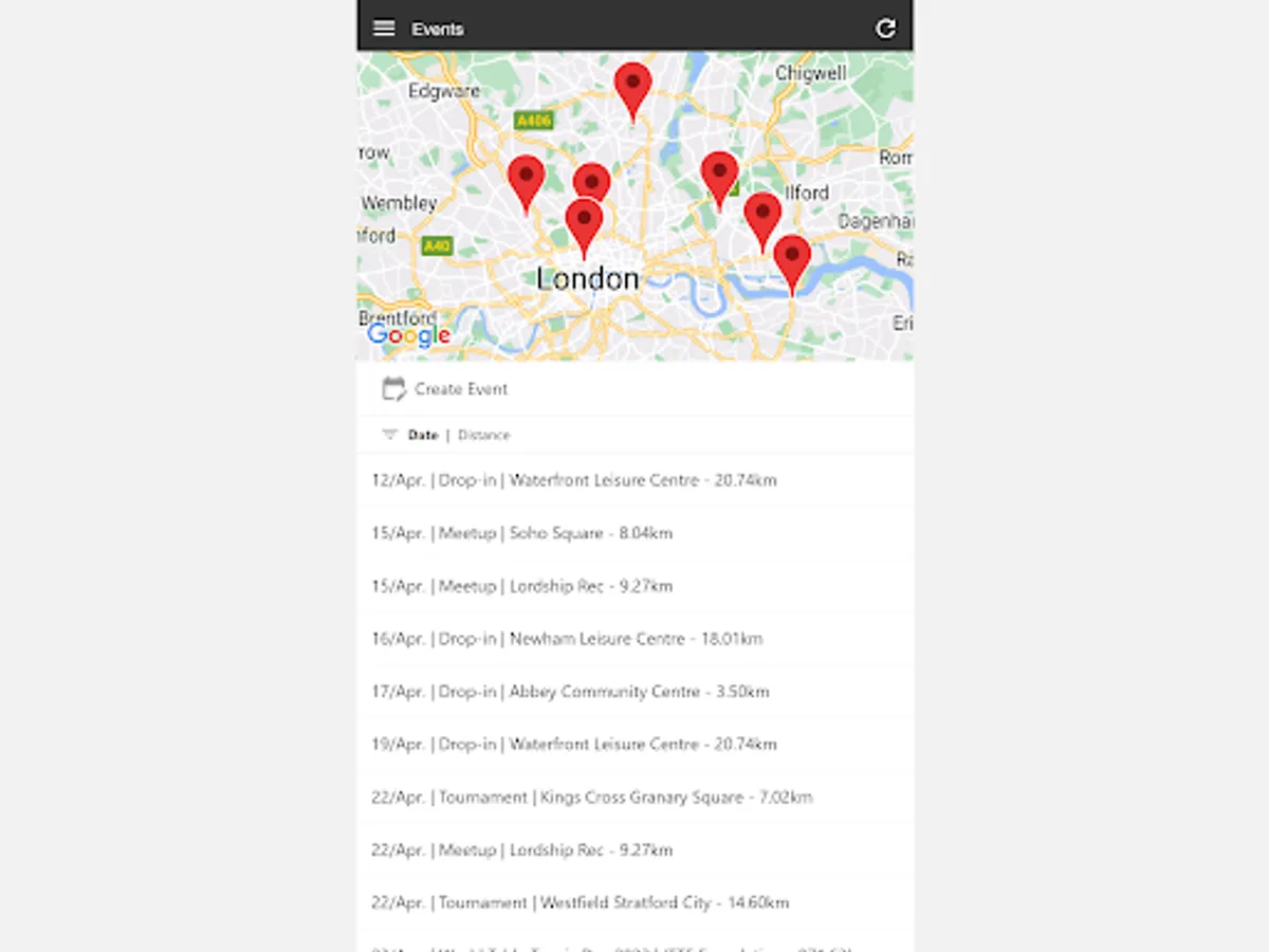 Find and create events at any Table Tennis location: club, coach, leisure centre, community centre, university, further education college, shopping mall, workplace, bar, venue, park and public tables. Event information and reminders appear automatically in the local city chat group and players can see a calendar of events for 100 kms in the app.
