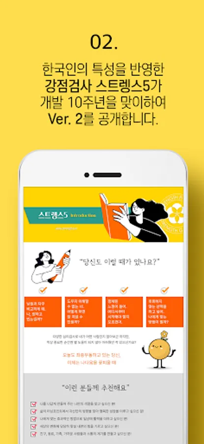 In the meantime, when you've done various psychological tests, there must have been times when you didn't understand the munhang-I or the test results didn't come well. This is because many tests are developed overseas and are different from ours. Therefore, Strength 5 reflected the characteristics of Koreans, standardized it for all age groups, and developed a strengths test for Koreans through scientific verification procedures. And in 2023, which marked the 10th anniversary of development, the upgraded Strength 5 Ver. 2 is finally revealed in front of you.