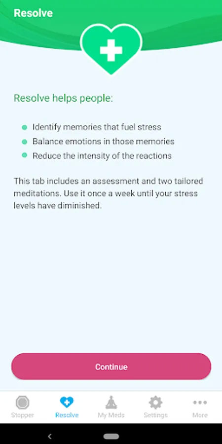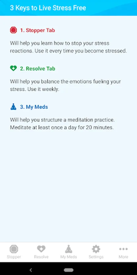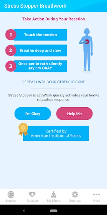 The key to living stress free is using this app daily. Every time you become stressed, press the app icon and breathe. Every time a Stress Stopper reminder shows up on your phone, breathe along with the animation. When it’s time to meditate, give yourself the 20-minutes of relaxation that will improve your life. And finally, get to the root of the issue. Use the Resolve Tab to heal any stressful memories from your past that may be affecting the quality of your present day life. Using all these tools together will prolong your life and help prevent future stress-related health issues such as cancer, panic attacks, anxiety, depression, cardiovascular and gastrointestinal diseases, migraines, sleep disorders, chronic fatigue, ulcers, etc.