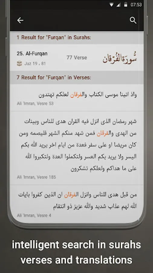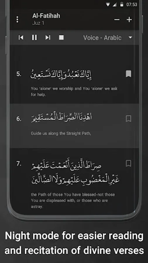 The large text of the verses and translation of the Quran and the separation of the verses, are other features of the of The Holy Quran comprehensive app, which has made reading the Quran much easier for you. In addition, by manually adjusting the text size, you can have a better experience in using the holy Quran. The ability to bookmark verses to find the last verse read is a feature used for complete reading Quran. The possibility of adding Quranic verses to favorites list is another feature of the app that allows you to find your favorite verses from the Holy Quran easily.