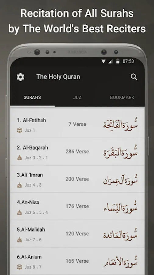 With The Holy Quran app, you will be able to read and listen to the Quran verses and Surahs, the app contains complete Quran text and recitation in Arabic and also Translation.