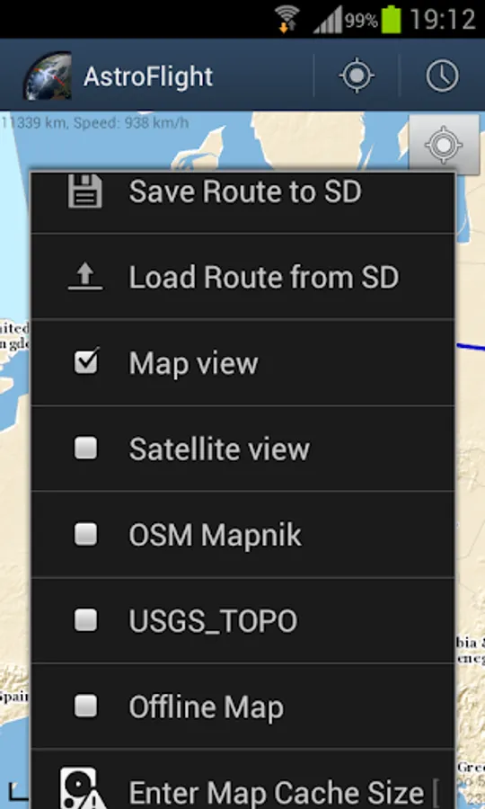 AstroFlight uses OpenStreepMap, which is capable to cache files for offline use. You can also load offline maps in the osmdroid folder of your SD card and share your offline maps with other apps using the OsmDroid library!