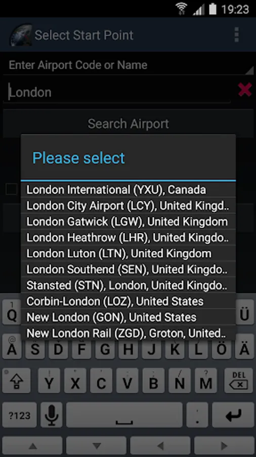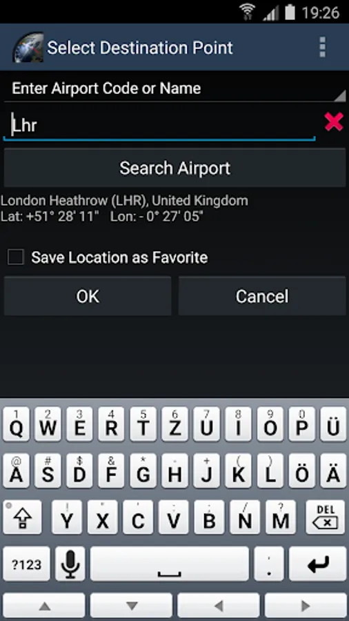 Select start and destination point and you will see your estimated flight route on a map. You can chose locations from a huge airport list with more than 9000 airports, including search by interantional airport code.