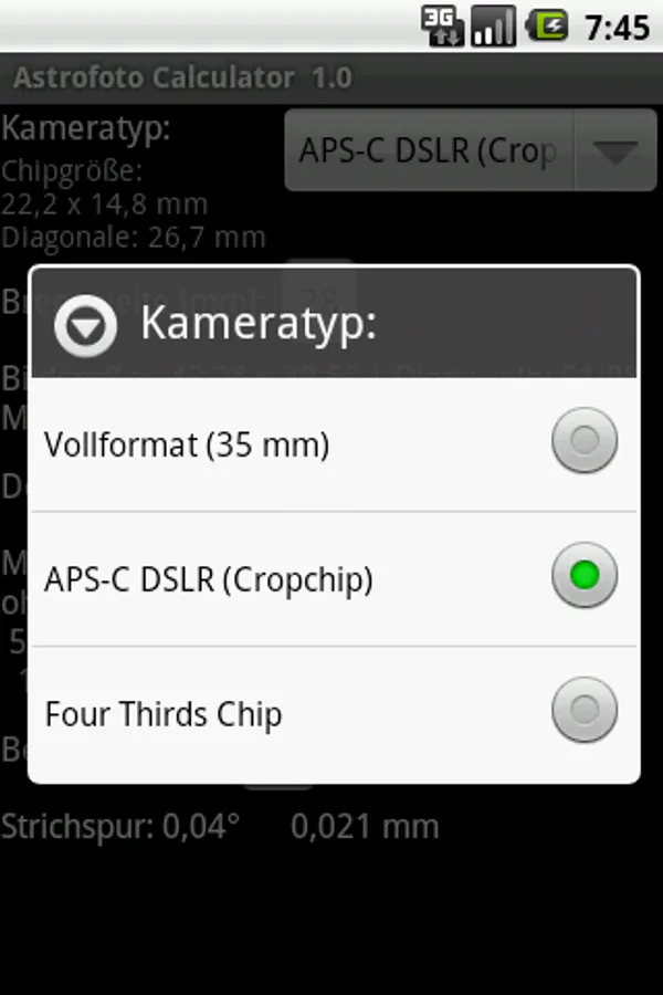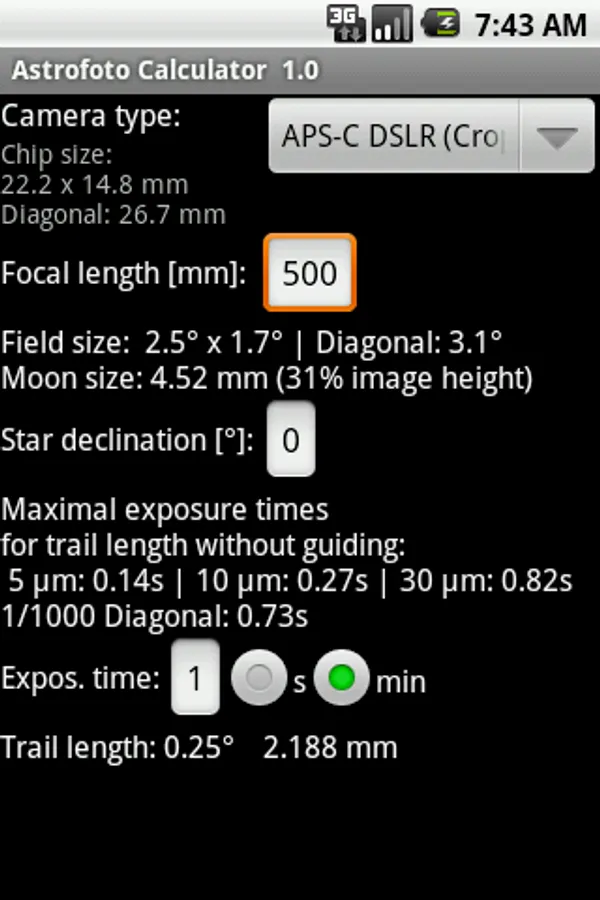 A small app for astro photographers for calculation of image filed sizes for certain combinations of camera and lens. You can also calculate the maximal exposure time for shots without guiding and calculate the length of star trails.