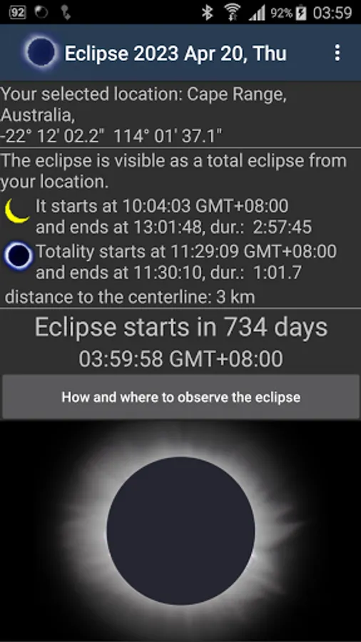 Learn, how to observe this eclipse and where you will find the best observation places. Although a bit of the eclipse will be seen from a large part of Australia, South-east Asia and the Pacific, you will get the best eclipse experience only in a narrow corridor. This app will guide you to the best places to enjoy this wonderful total eclipse and tells you what you need to observe it safely!