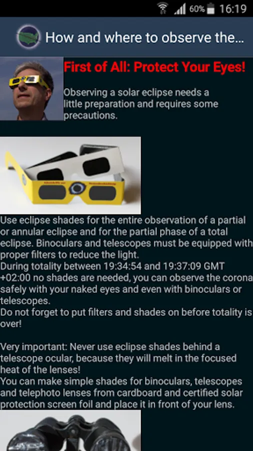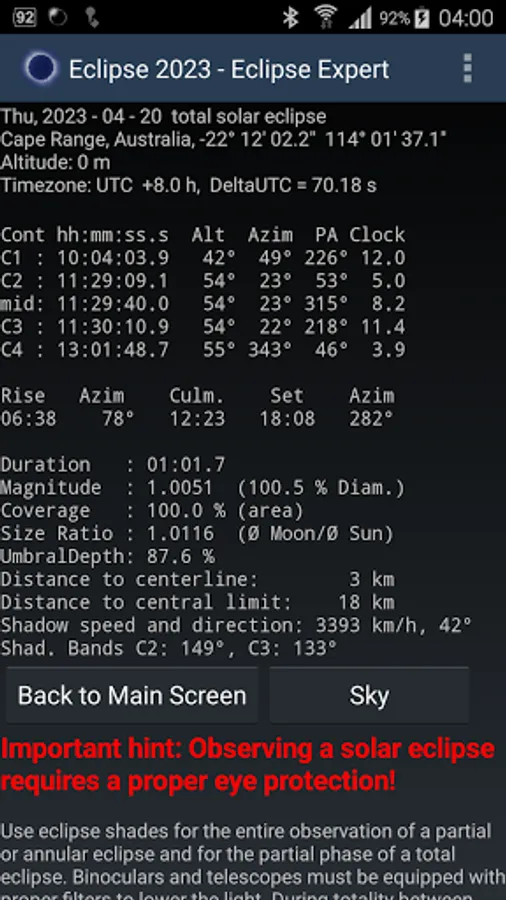 Engaged amateur astronomers will enjoy a screen with detailed information of the local circumstances of the eclipse.