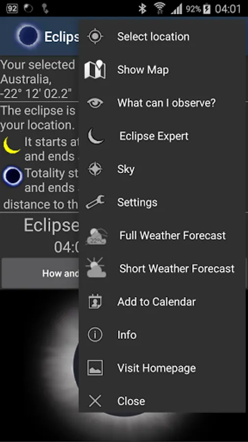 To be reminded of the eclipse you can add the calculated timings to your personal android calendar. From the menu you get direct links to weather prospect websites for your location.