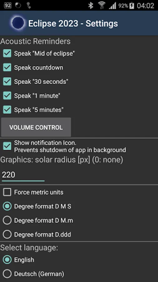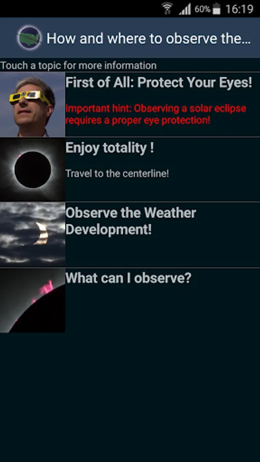 The app informs you about the exact timings of the eclipse based on your individual GPS or network position. It will show you a map with the entire eclipse path, giving you details on times and local circumstances. Even before the eclipse you can see an animation of the event as it will be seen from your location. When the eclipse is in progress, it will show a realtime animation of the celestial event. You will hear acoustic announcements of important stages of the eclipse and see a countdown on your display. Search your favorite location from a huge database or from the map or simply use your actual device position.