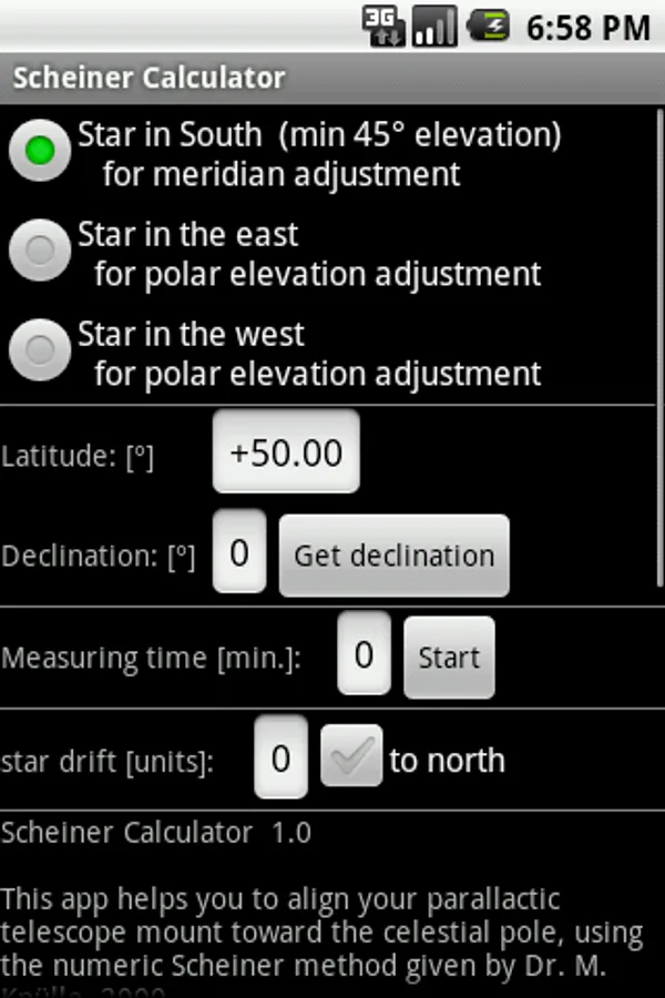 This app helps you to align your parallactic telescope mount toward the celestial pole, using the numeric Scheiner method given by Dr. M. Knülle, 2000. A mus have for every serious astronomer and astrophotographer.