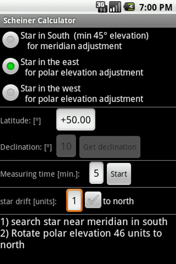 Start with the meridian adjustment, observing a star near the meridian in the south with a minimal elevation of about 45 deg. For obtaining the declination, place your phone flat on the telescope tube, pointing its top side to the star.