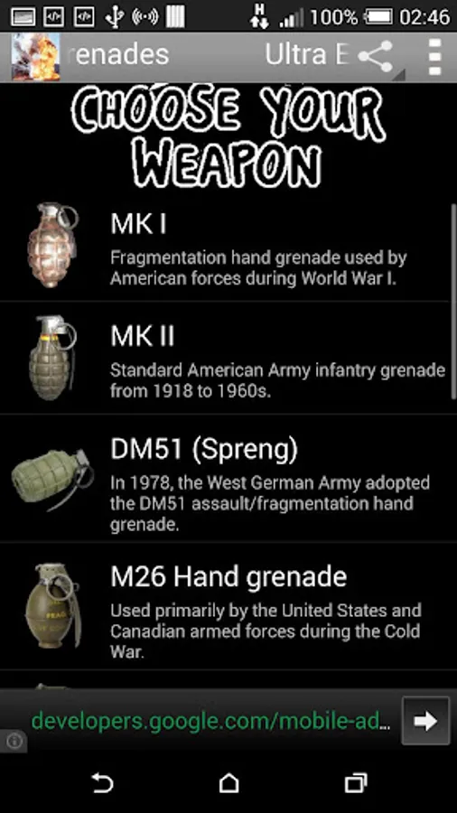 All Ultra Extreme weapons in the game: MK1 Fragmentation Hand Grenade, MK2 Standard American Army infantry, DM51 West German hand grenade, M26, M67- Made in USA, Mills Bomb Mk1, F1-France, F1-Australia, 1914 Egg and 34 Egg Grenade.