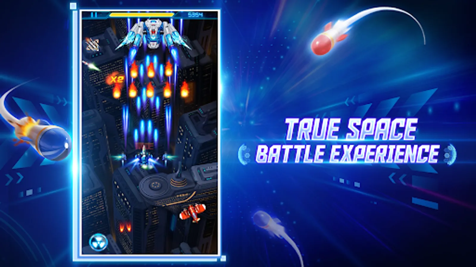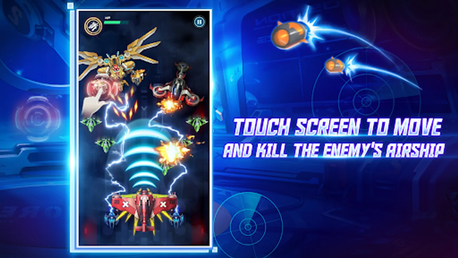 The game features an achievements and leaderboard system, allowing players to compete against each other for the top spot. Controls are straightforward, with screen slide to move the aircraft and a supershot button touch to fire supershot using gauge collected on top of the screen. A bomb button touch can also be used to fire a bomb to block enemy fire for some time.