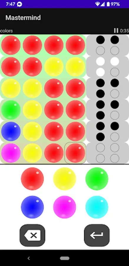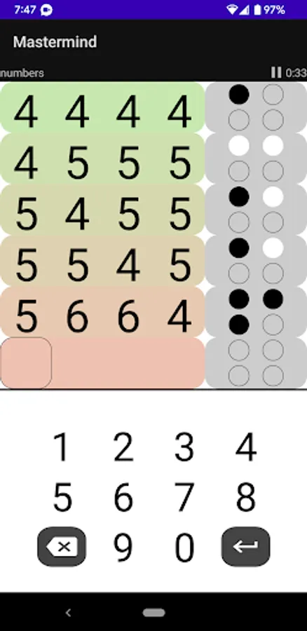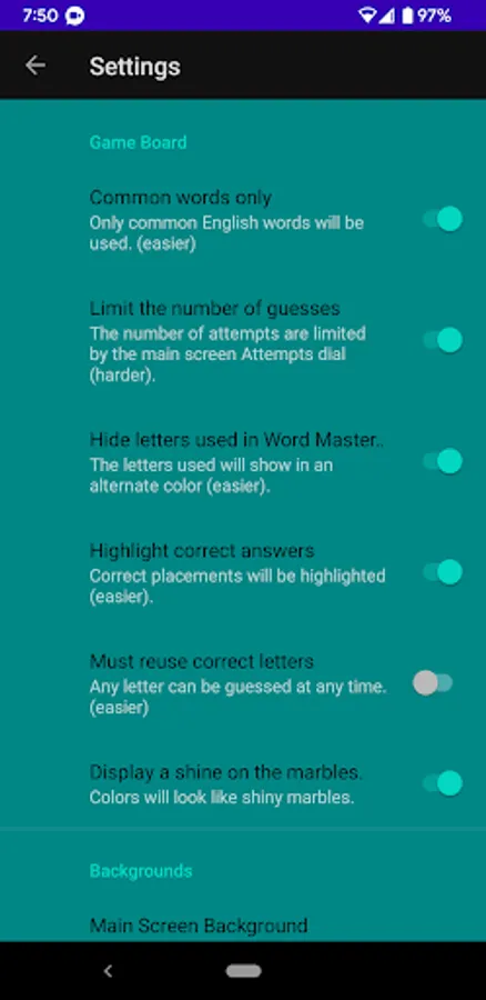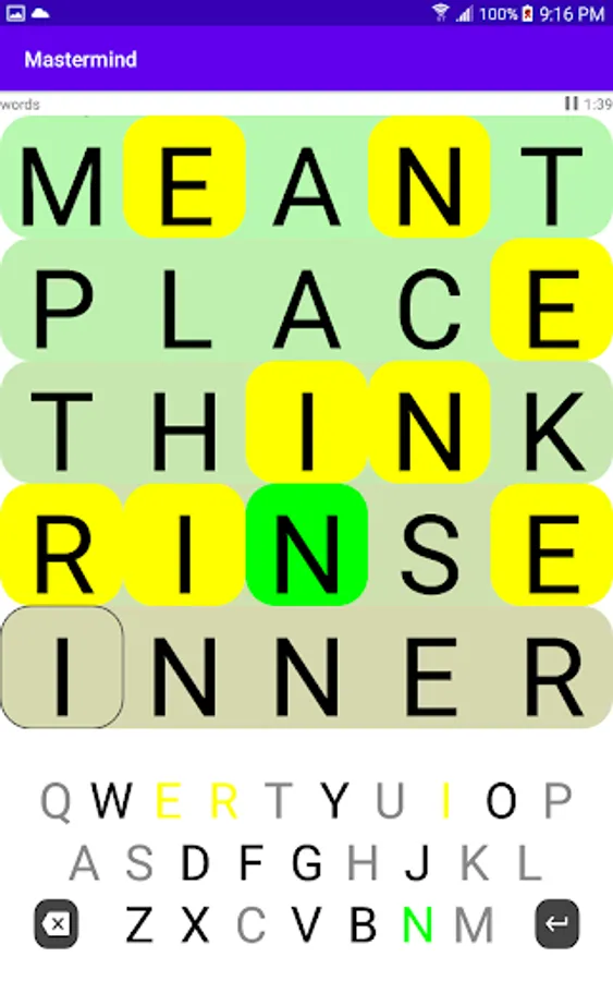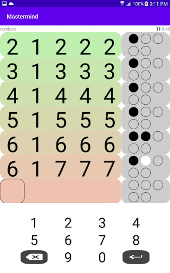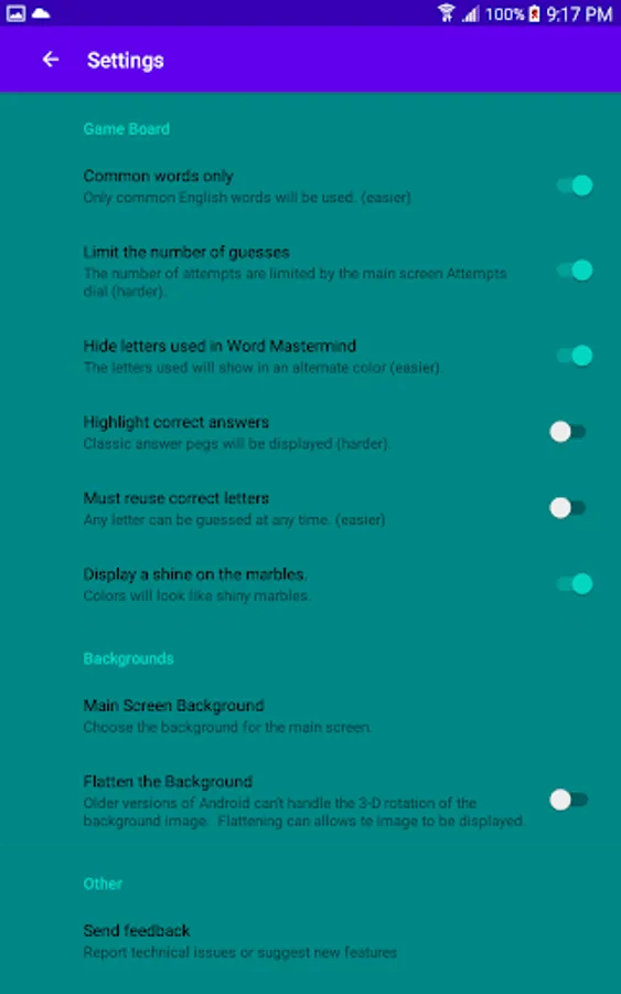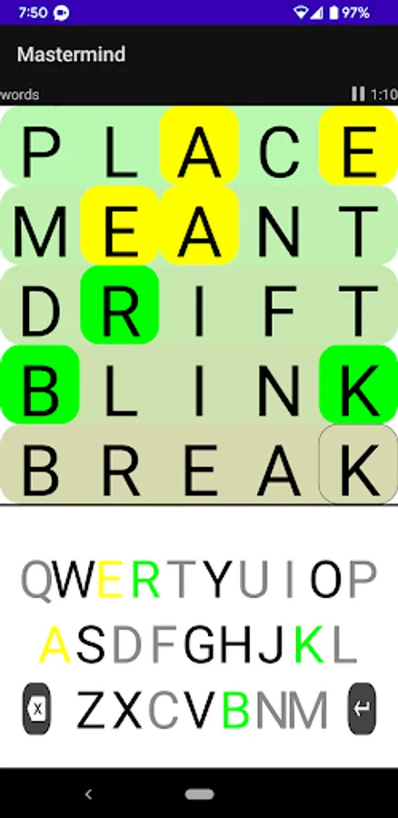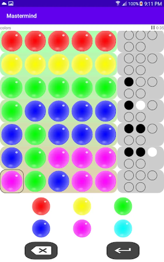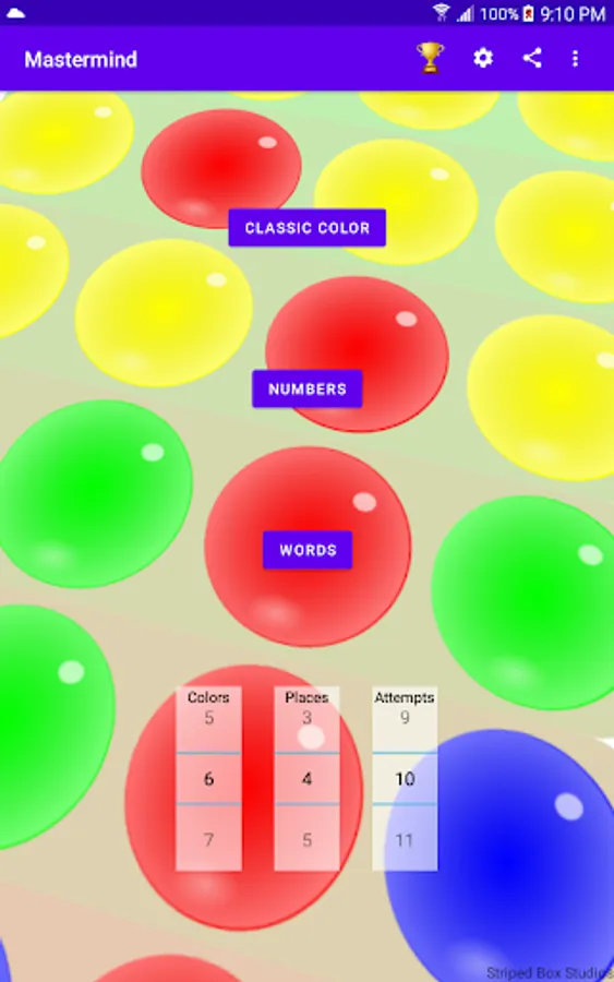 There are three modes of play: colored marbles, numbers and words. Each has a different inherent difficulty. For example, a 6-color puzzle with 4 placements (the classic version of the game) has 1296 possible combinations. A 10-digit number puzzle with the same number of placements has 10,000 possible combinations. The word game requires that each guess is an English word and a dictionary of over 100K English words is used to validate guesses. A smaller list of around 4000 common words is used for code words.