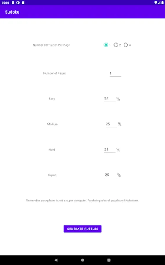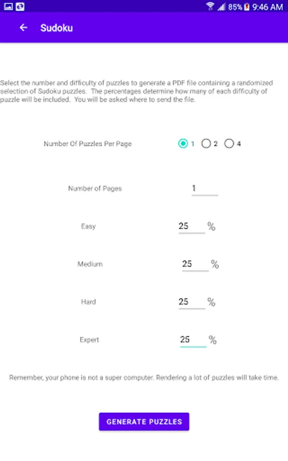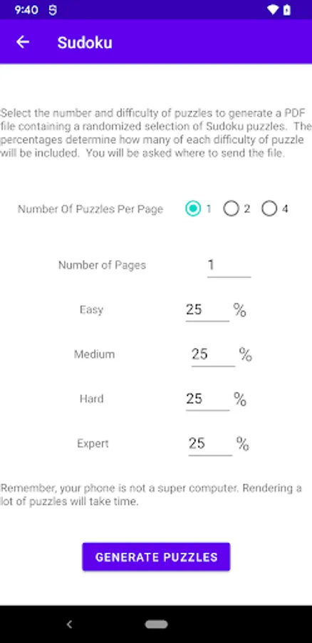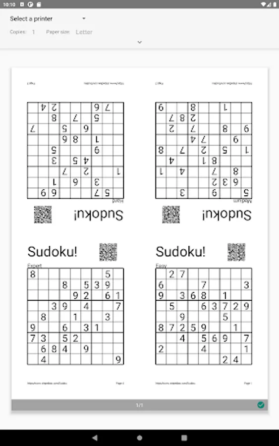 The app also allows you to generate puzzle booklets that can be printed and handed out to your friends and co-workers. Each printed puzzle has a QR code that will allow the same puzzle to be opened in the app where you can check the solution or solve it yourself. You can print single puzzles, two puzzles side-by-side, or four puzzles on a single sheet that can be folded into quarters to create a booklet. You can take the game with you even when electronics aren't available.