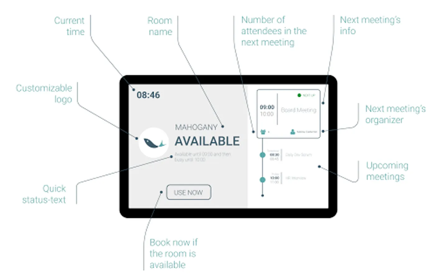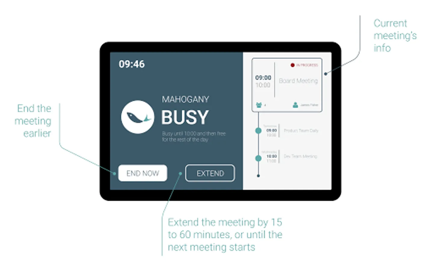 • Intuitive quick-action buttons allow you to schedule, extend, or end meetings with a simple tap