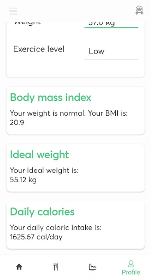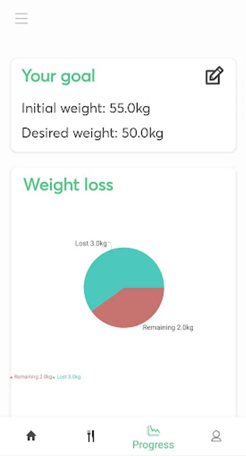 - Evolution graph of your weight: if you save your weight from time to time, you are going to be able to see your evolution in a graph. It is going to help you to keep motivated and to see how many kg you have to lose to achieve your objective.