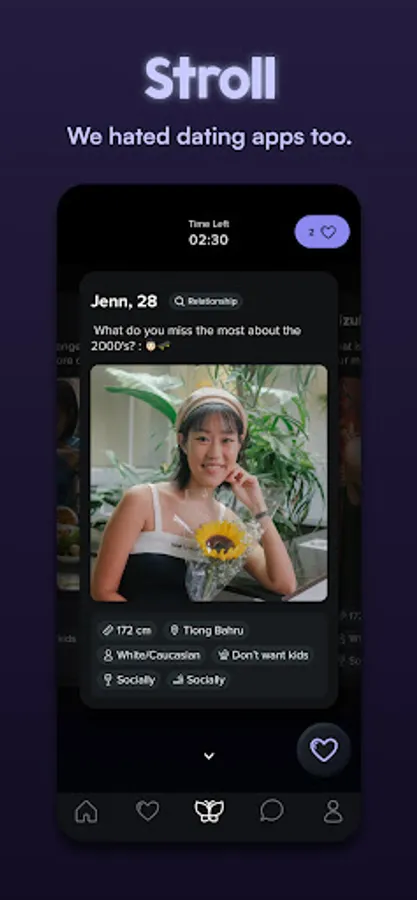“What do humans live for, if not for sincere love?” encapsulates everything that Stroll is about. The app is designed to get you off your phone, to skip the small talk, the “Heyyy”, the “Wyd” and to get you diving straight into the fun or deep conversations. Stroll is intentionally divisive.